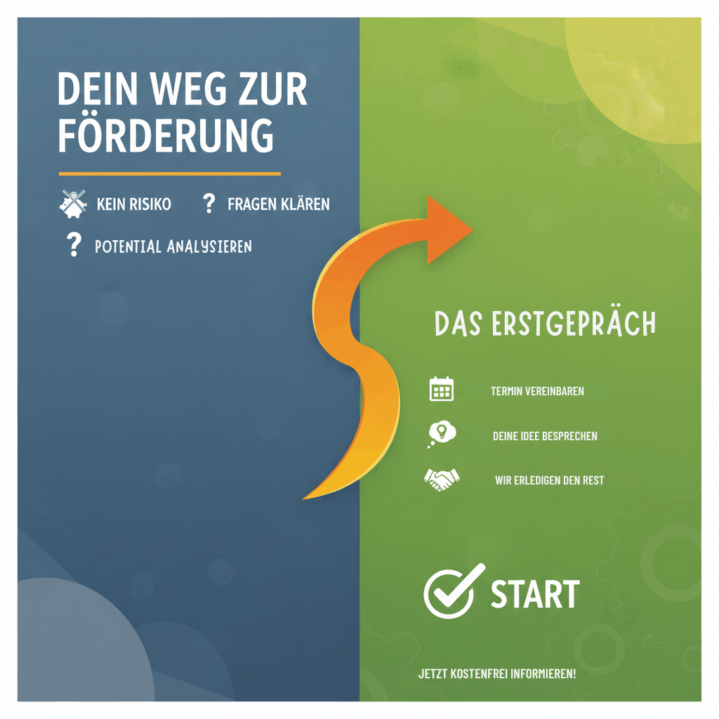 Schritt 1: Das Gespräch Sie füllen einen kurzen Fragekatalog im Erstgespräch aus – 10 bis 15 Minuten. Wir schauen, ob Ihr Projekt grundsätzlich förderfähig ist.